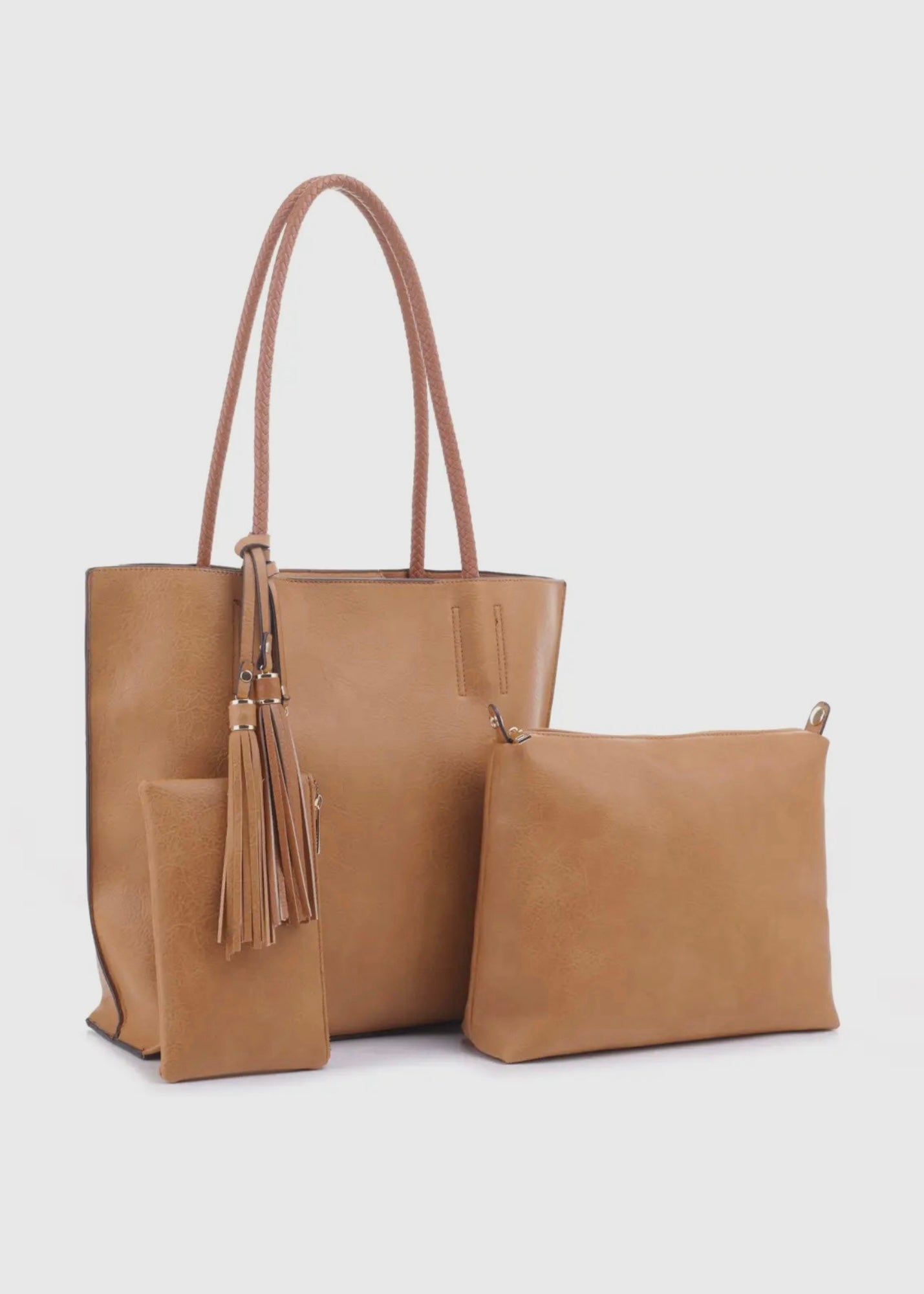 This 3-piece tote set, accented with a tassel, offers versatile size options to match any outfit. With an open top and lined interior, it features a wristlet attached to the exterior and shoulder straps with an 11 inch drop. Dimensions are 12.5 inches in length, 4 inches in width, and 13.25 inches in height.