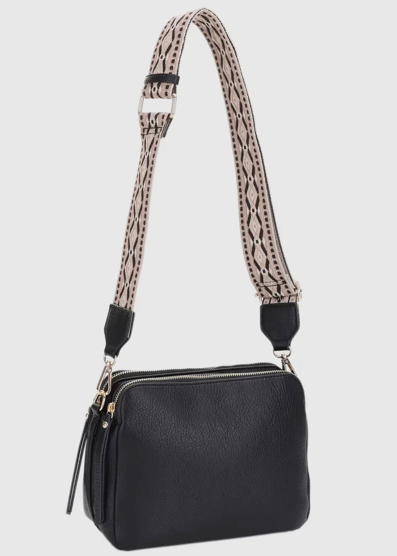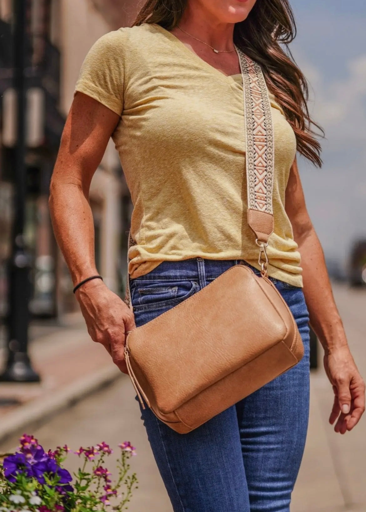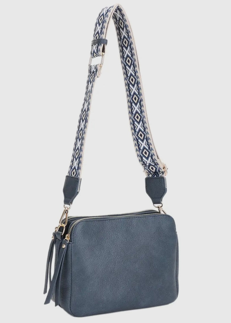 Expertly crafted with a stylish design, the Blake Crossbody Bag is both fashionable and functional. Its 3 compartments, gold hardware, and inside pockets make it the perfect accessory for any outfit. The adjustable strap allows for hands-free convenience on the go. Measurements: 9.5" x 3.75" x 7.25".