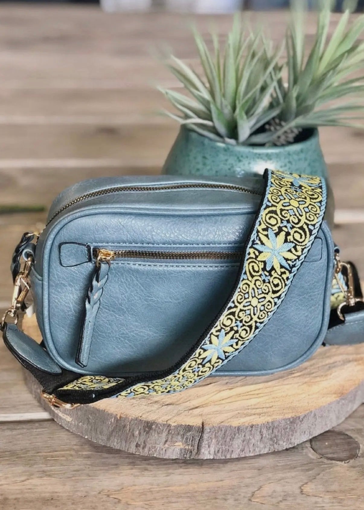Chic boho purse with guitar strap. Purse made of a soft vegan leather with a zip closure, gold tone hardware and detachable strap.