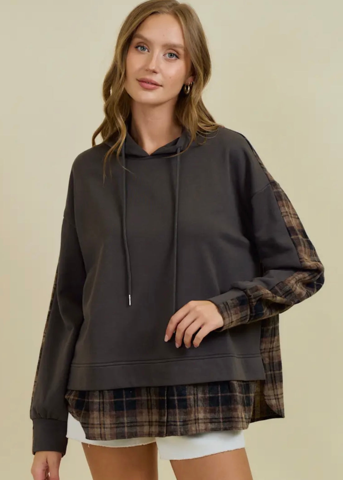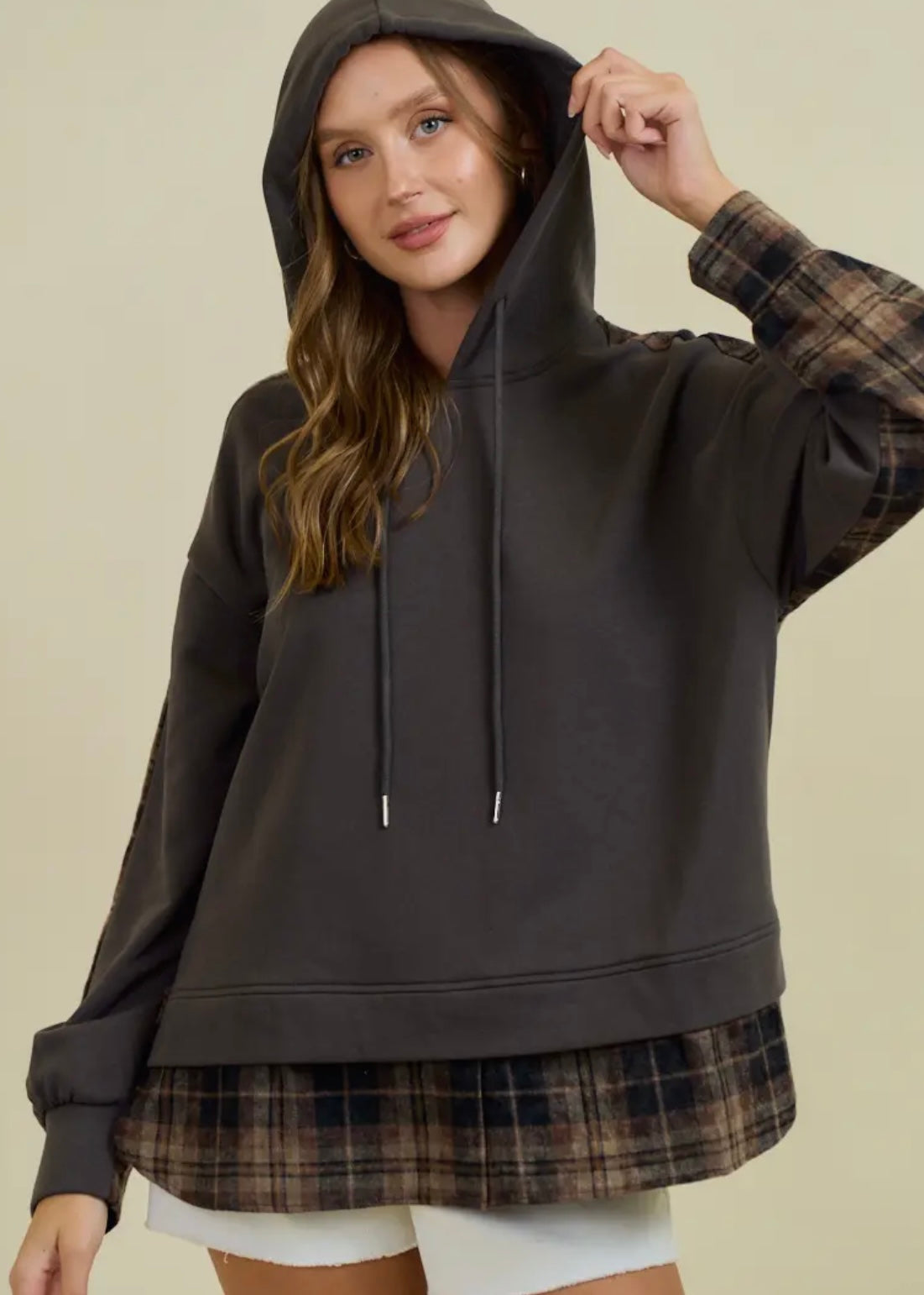 Add a pop of cozy, laidback style to your wardrobe with our French Terry & Flannel Plaid Hoodie. Made with soft French terry fabric, this pullover design includes an adjustable drawstring hood and trendy flannel plaid accents on the sleeves and hem. Perfect for layering and everyday wear, this relaxed fit hoodie is a must-have. (Style measurements: Total Length 27", Shoulder 23", Bust 23 1/2", Sleeve Length 20")