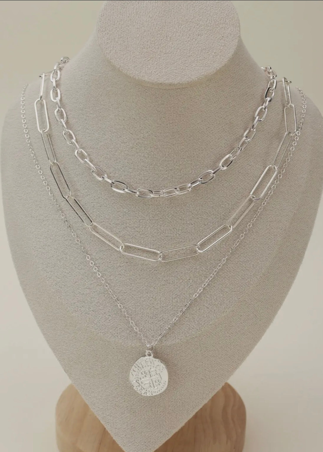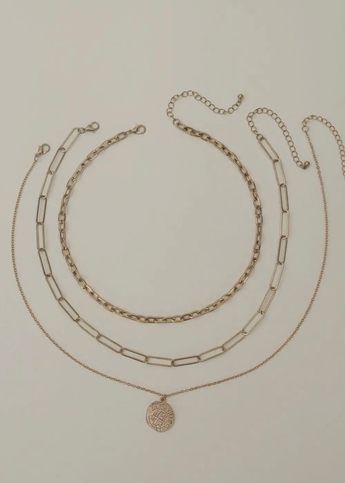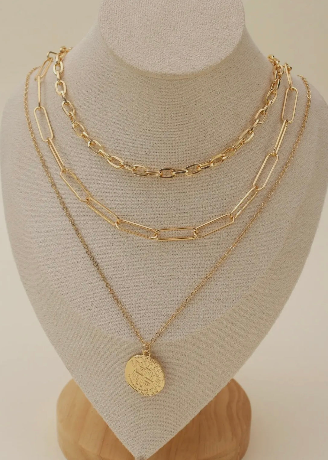 This multi-layered chain necklace set features a stunning pendant that adds a touch of elegance to any outfit. Elevate your look and make a statement with this must-have accessory.