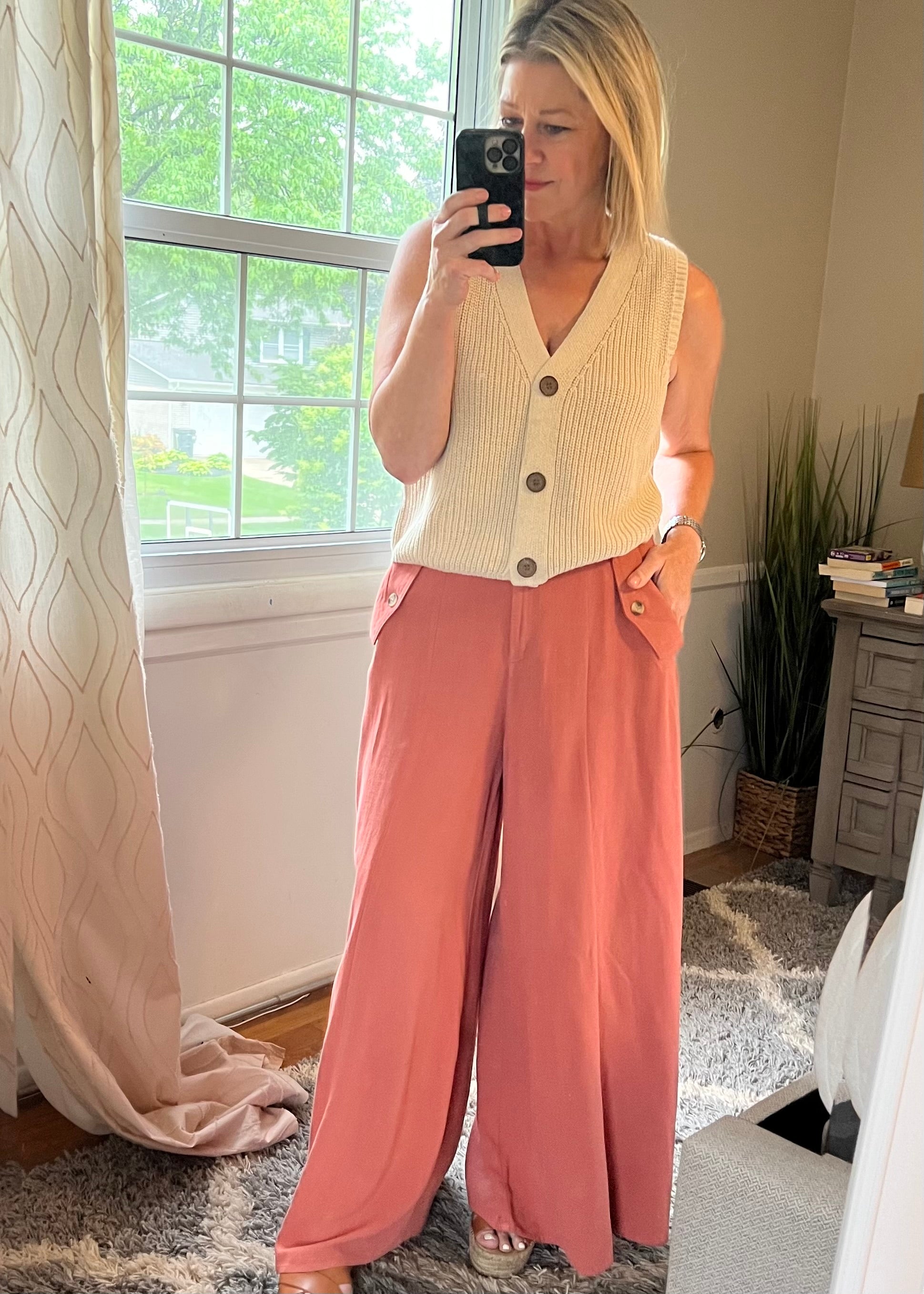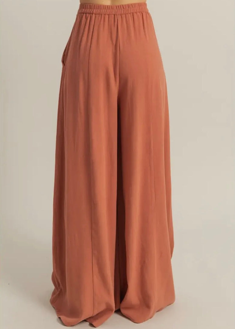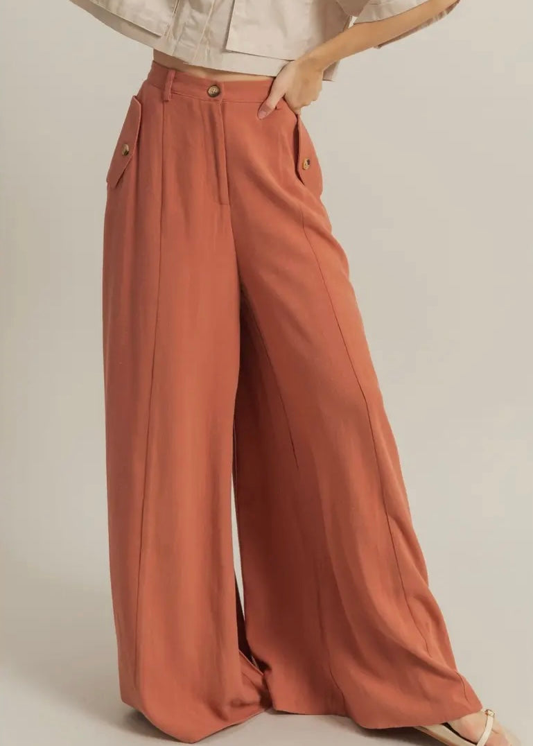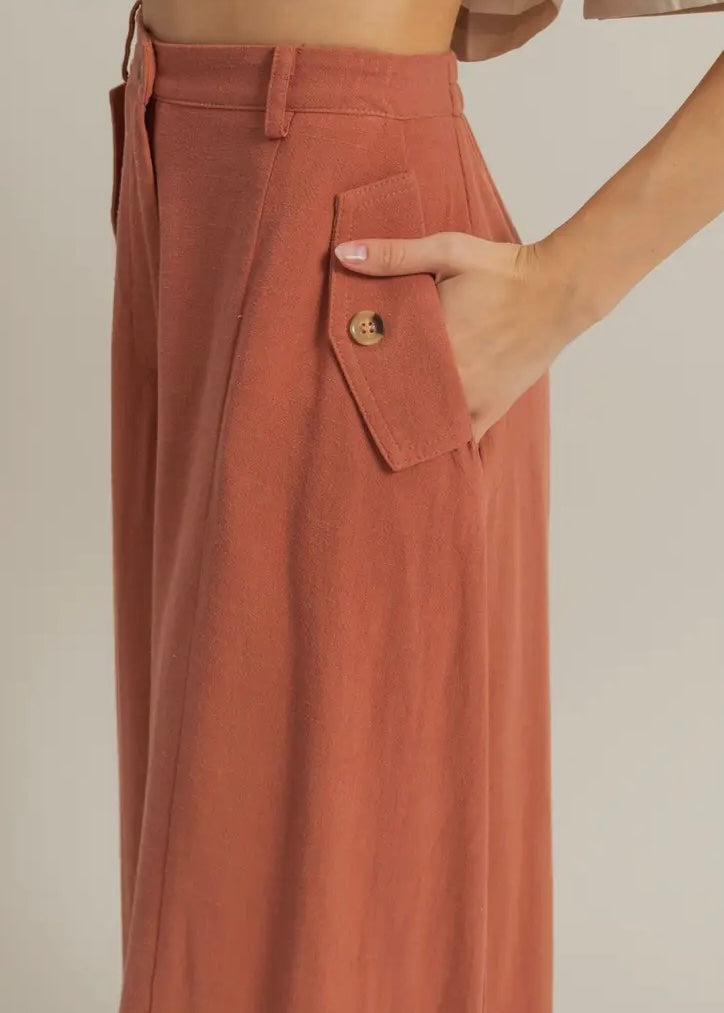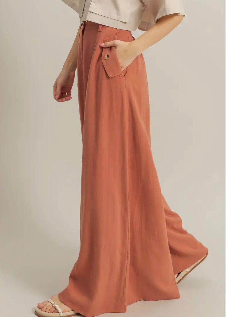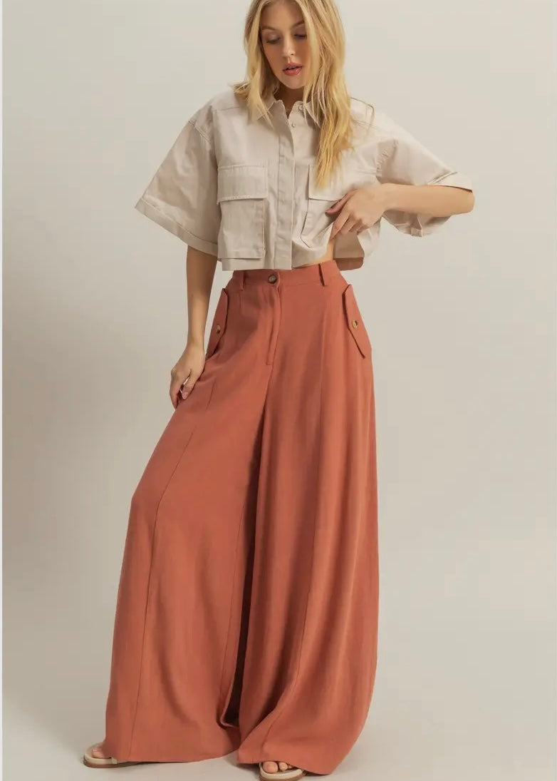 Indulge in luxury with our Linen Blend Flowy Pants. Perfect for summer days, the high, banded waist and super wide cut offer a flowy silhouette that will keep you stylish and cool. Trendy side pockets and top button add the perfect finishing touches. Elevate your wardrobe with these essential pants.