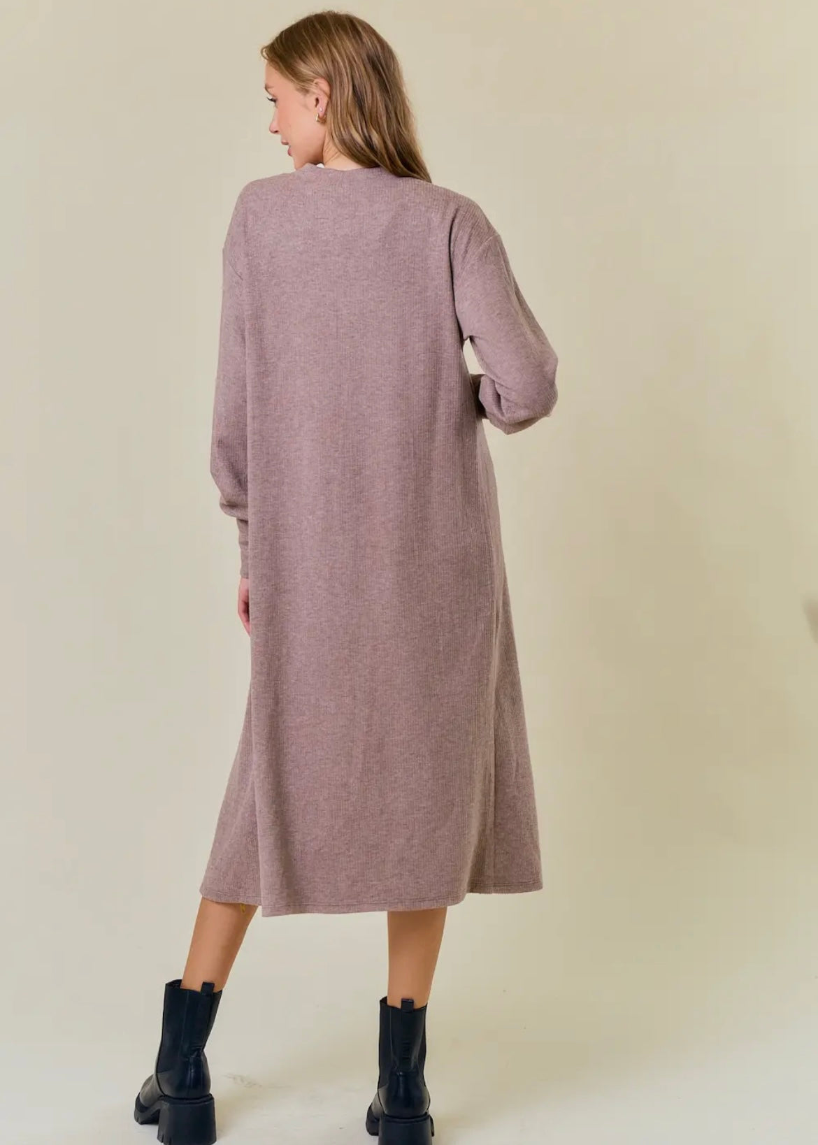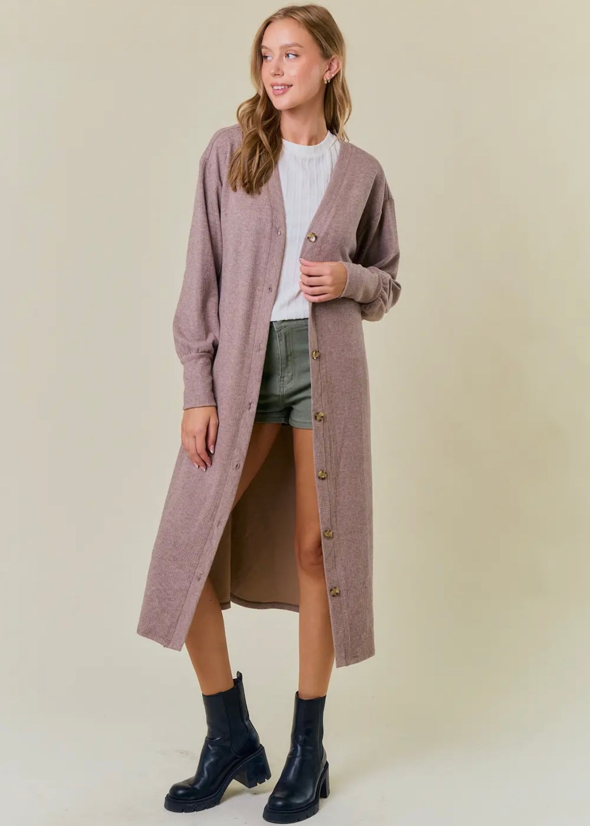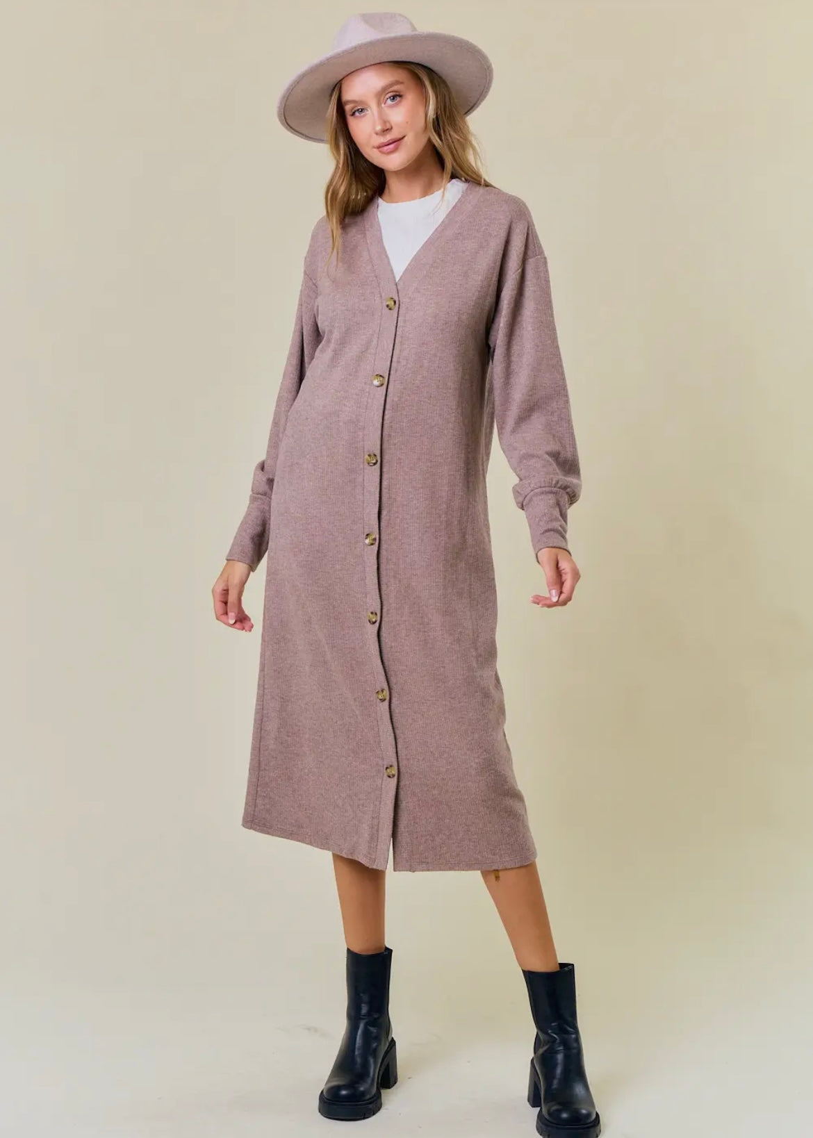 Experience comfort and style with our Long Cardigan/Dress! Featuring a V Neck design and puff long sleeves, this versatile dress can be buttoned down and worn as a dress or left open for a chic cardigan look. The deep taupe color adds a touch of sophistication to any outfit.