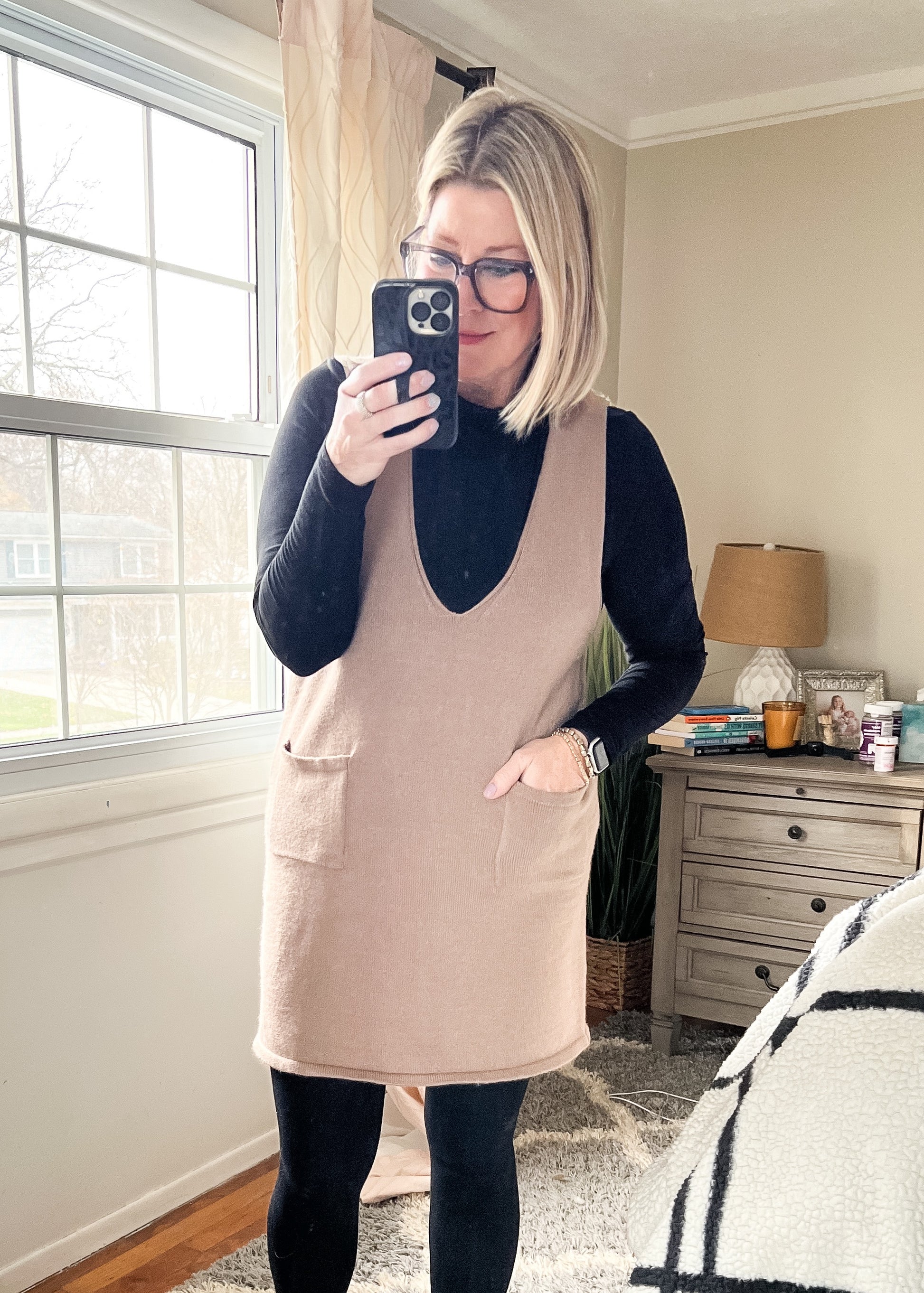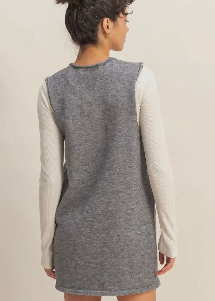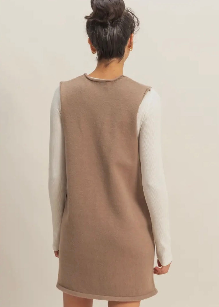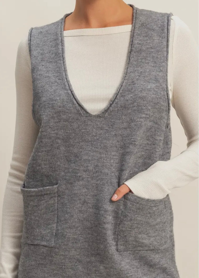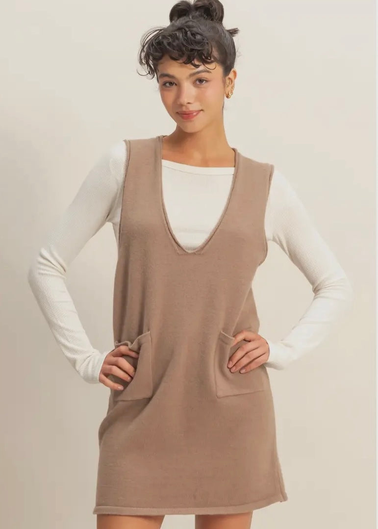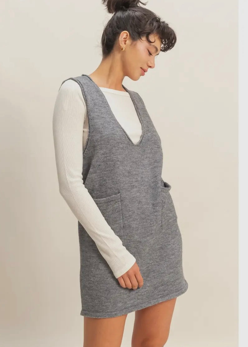 This knit Pocket Pinafore Dress provides the perfect layering option for a casual and comfortable look. With a deep V-neckline and two front patch pockets, this dress offers versatility for styling options. Made with a soft knit material and relaxed fit, it ensures comfort and ease of movement. Ideal for both casual outings and relaxed weekends at home.