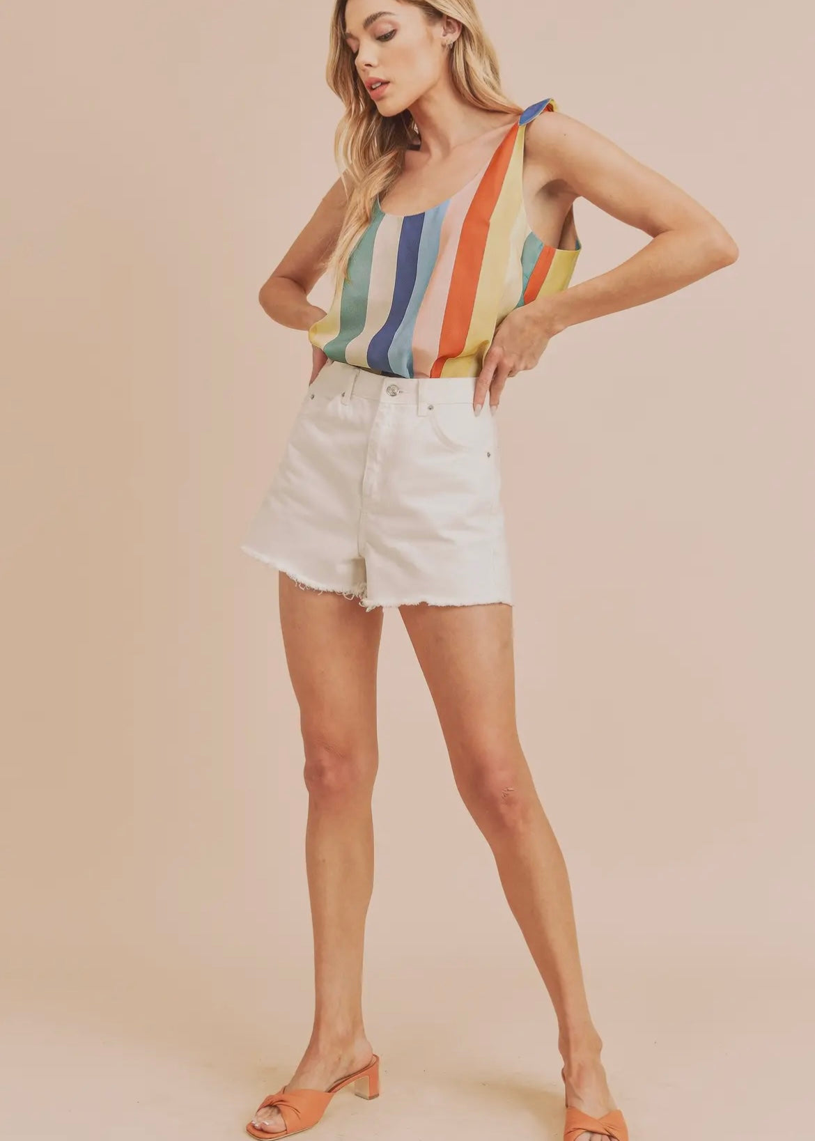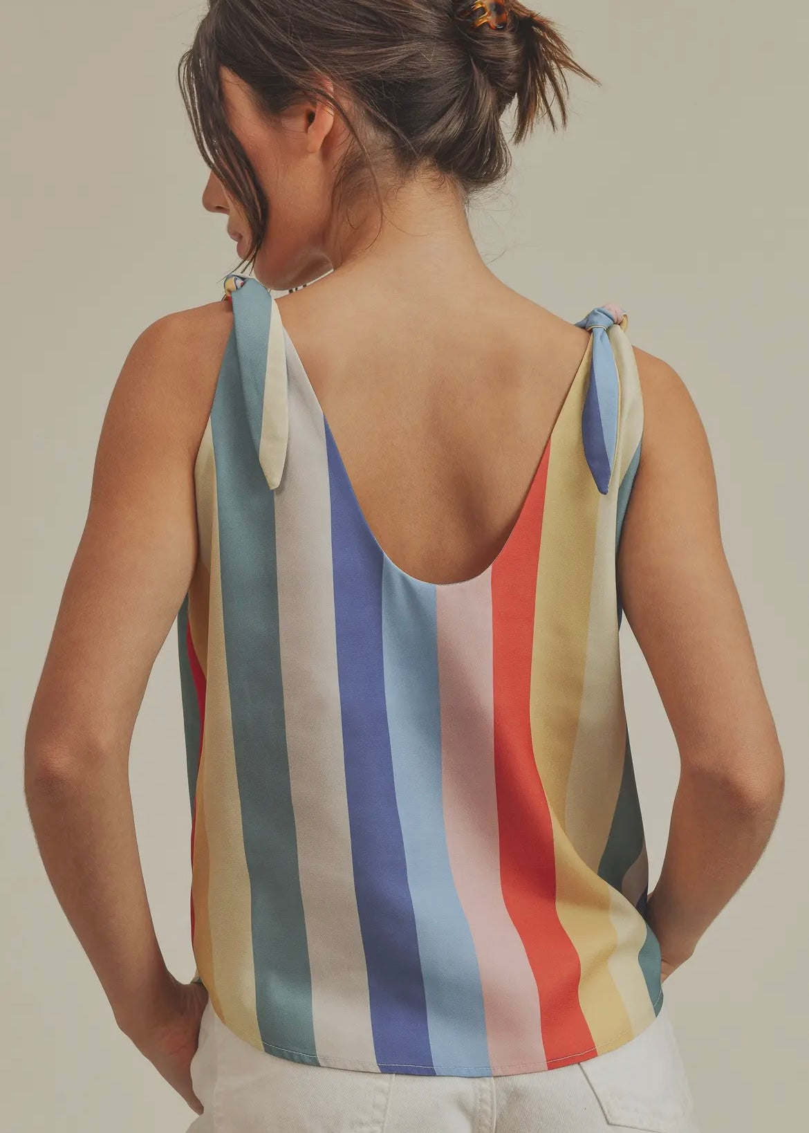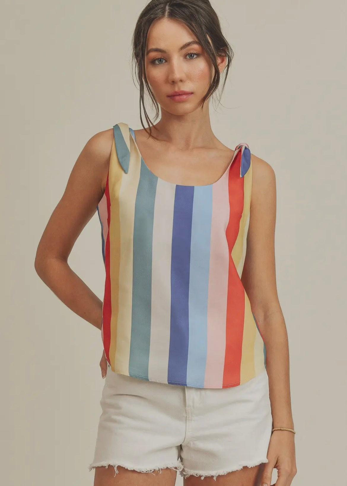 Experience the epitome of summer fashion with our Striped Tank! The shoulder ties add a touch of charm to this sunny day must-have. Its colorful striped pattern and flattering silhouette make it perfect for everyone.