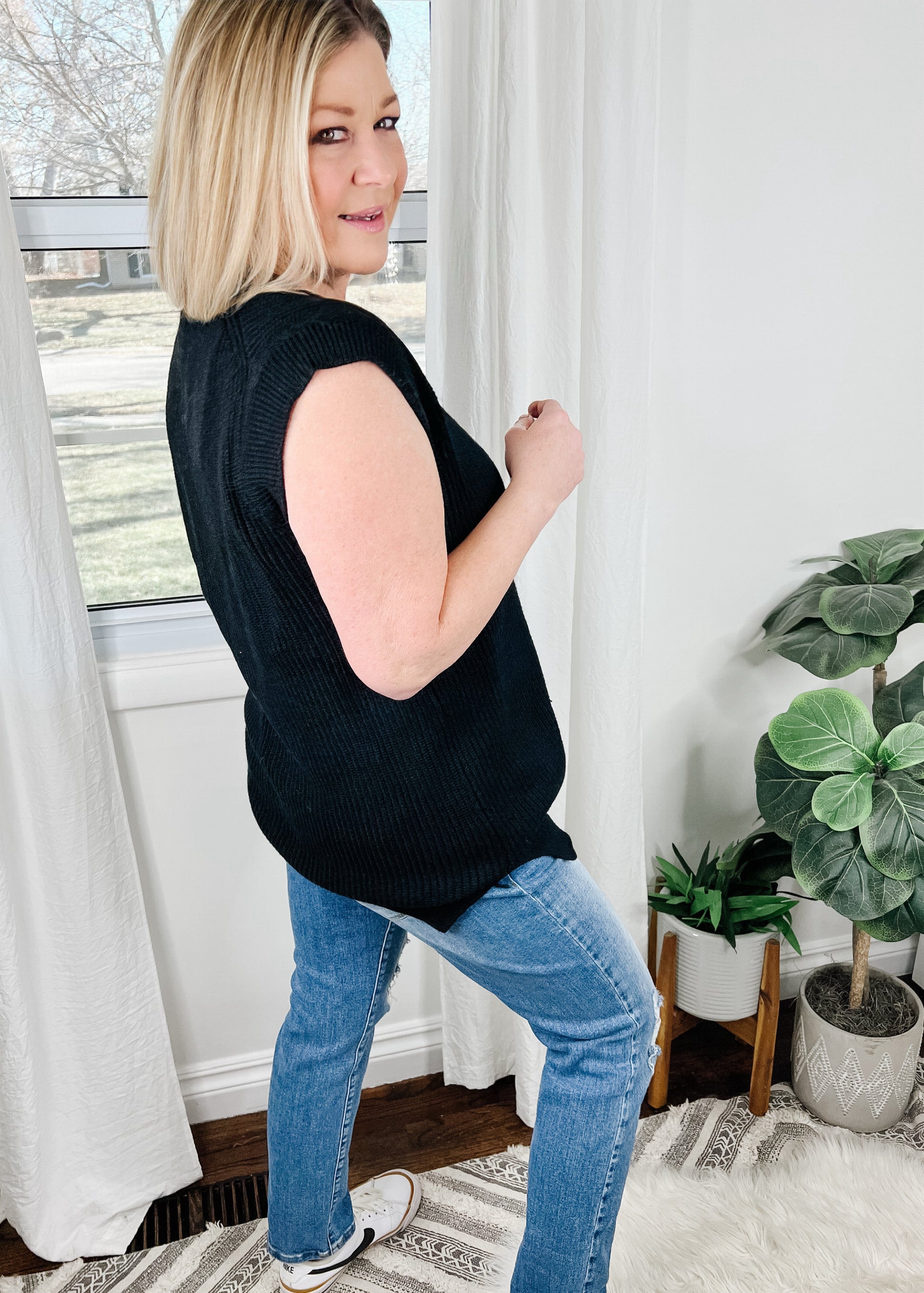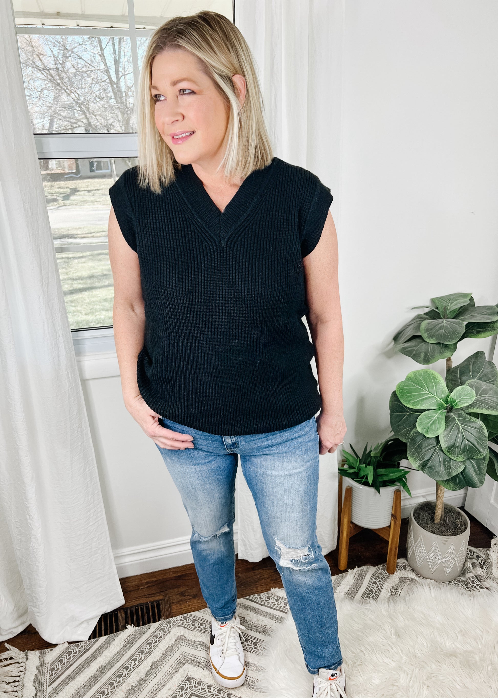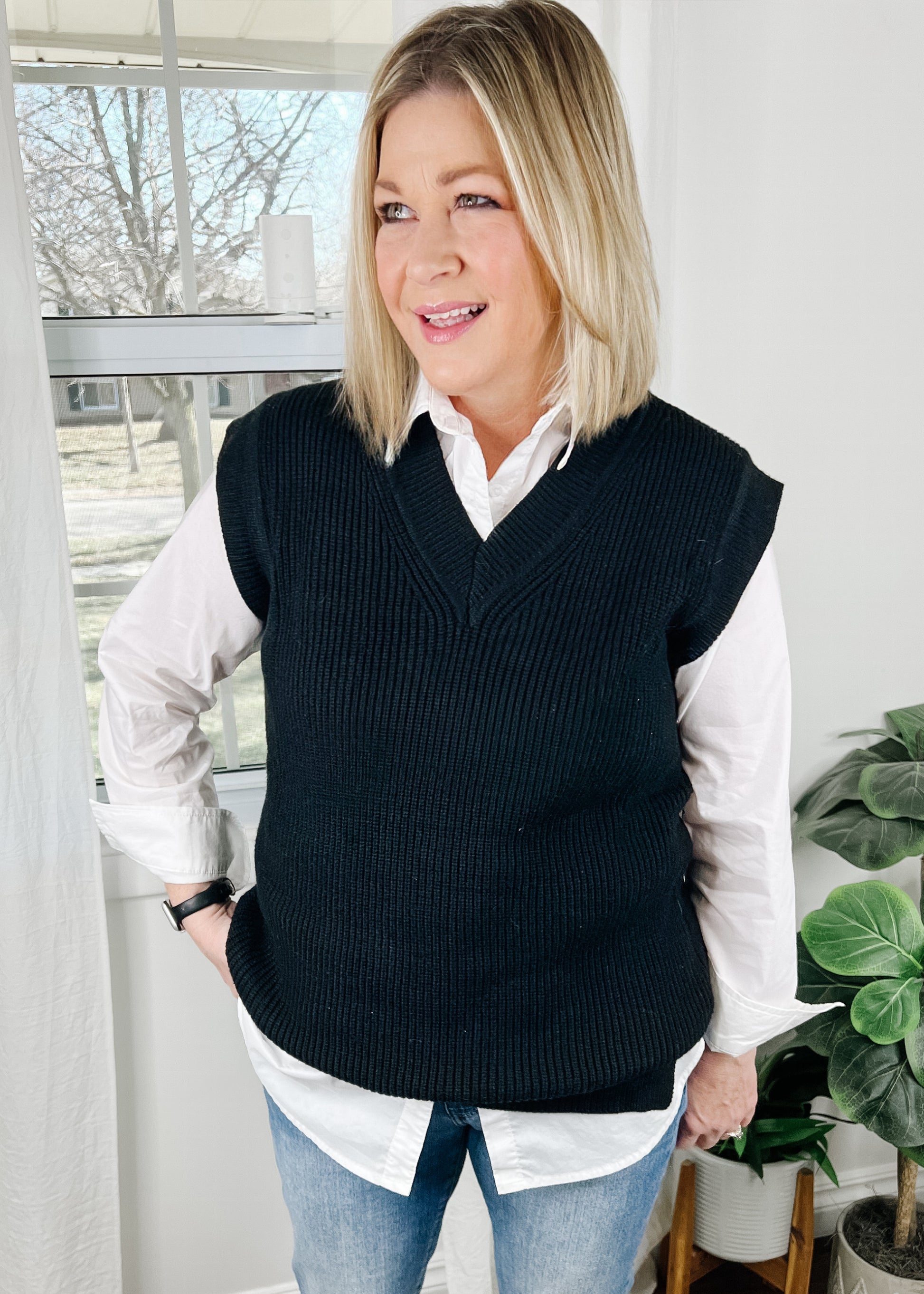Experience timeless style and comfort with our classic black sweater vest. This sleeveless v-neck vest features a straight hemline for a flattering fit. Elevate your wardrobe with this versatile piece that can be dressed up or down for any occasion. Runs big, size down.