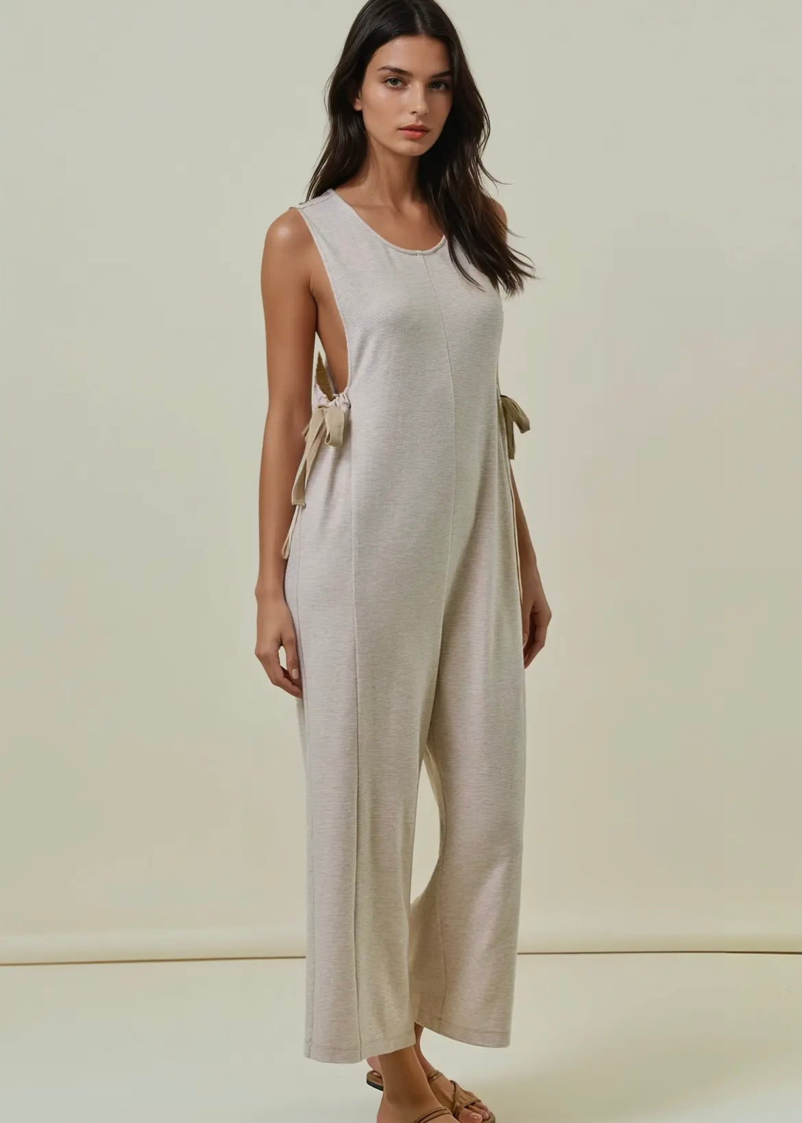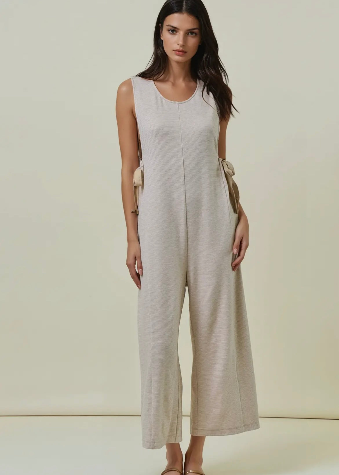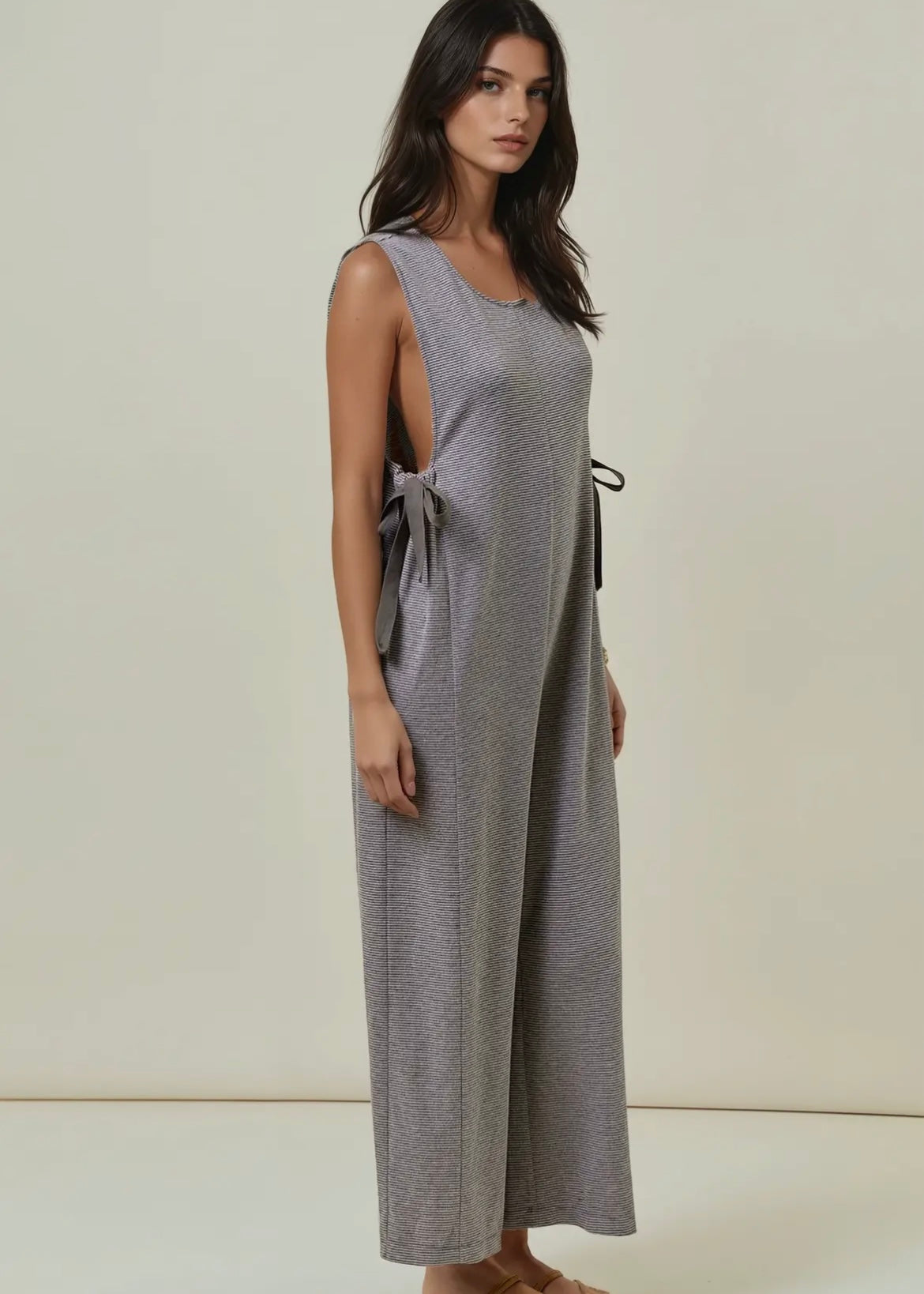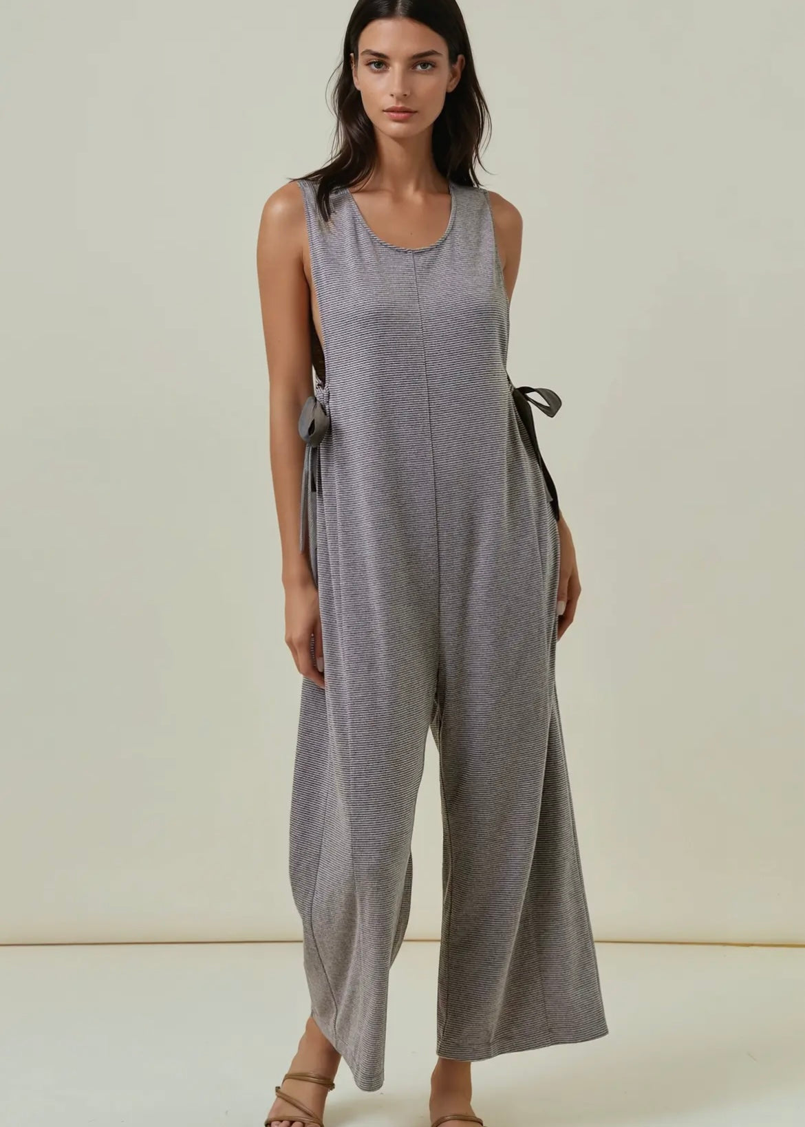 Soft overalls made with ultra-soft, lightweight knit fabric for all-day comfort. The subtle striped pattern adds texture and interest, while the chic side ribbon ties allow for an adjustable fit and feminine detail. The relaxed, wide-leg silhouette gives off a modern and effortless vibe.