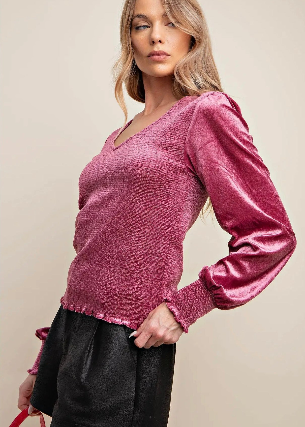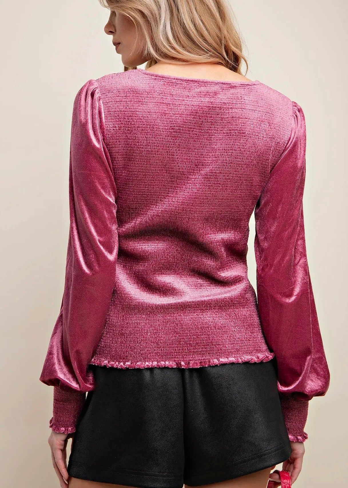 Get ready to feel luxurious with our Velvet Smocked Top. Made from soft velvet, this top features a smocked bodice and bishop sleeves with smocking at the wrist for a touch of elegance. In a bright mauve color, this top will surely elevate your style!